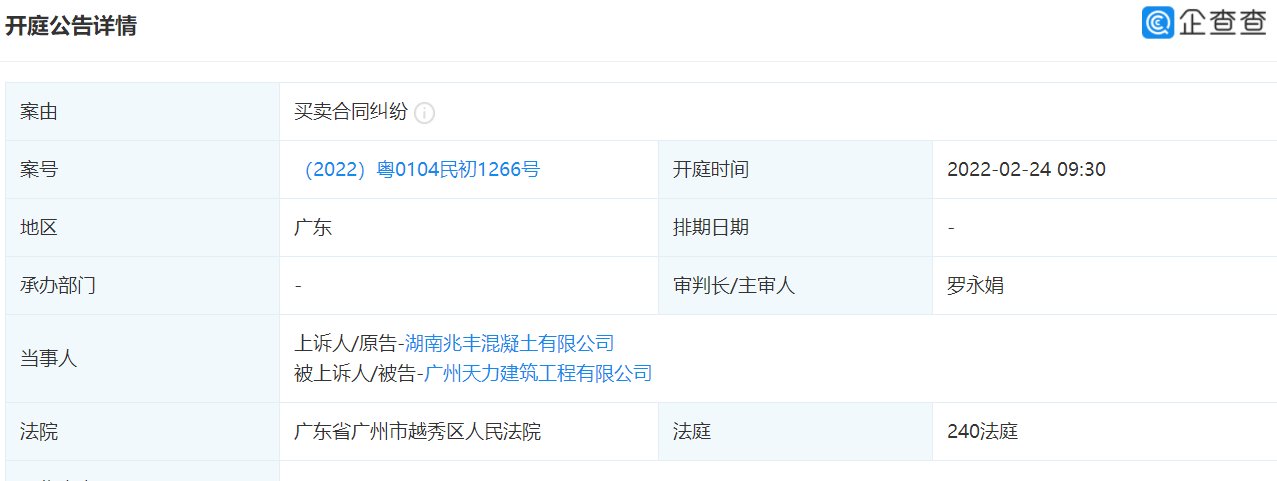 湖南兆丰混凝土状告广州天力建筑工程,案由系