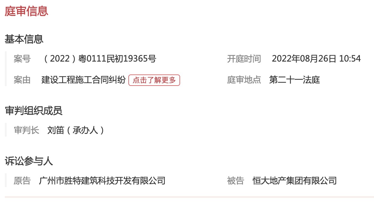 ??乐居财经 严明会 8月26日,恒大地产集团有限公司新增开庭公告,原告为广州市胜特建筑科技开发有限公司,被告为恒大地产集团有限公司,案号 为(2022)粤0111民初号,案由系建设工程施工合同纠纷。 案件于2022年8月26日在广州市白云区人民法院开庭审理。