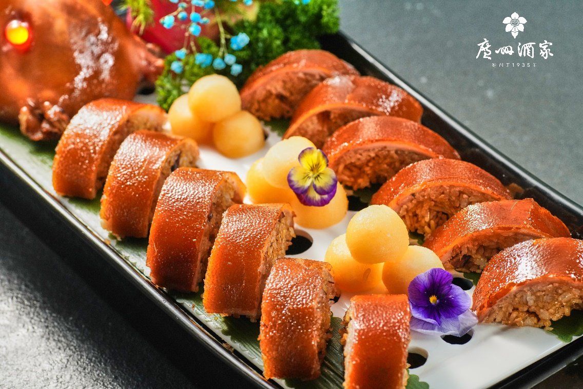 精选5-6斤鲜活生乳猪,填入安虾、腊味、糯米等多种食材,炭烧烤制,让糯米与乳猪同时受热相互融合,猪肉锁紧糯米、吸入米香的同时,糯米充分吸收猪肉的香甜味。色泽金黄,皮脆软滑肉嫩,味鲜香。